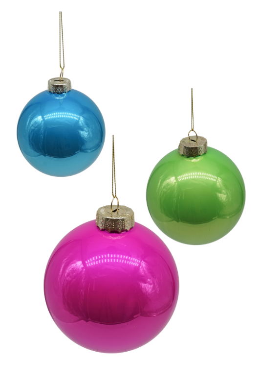 ბურთები მინის ცალობით, ნეონის - მწვანე/ლურჯი/ვარდისფერი D10სმ, 12ც