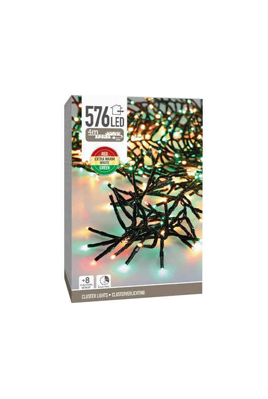 განათება 576LED თბილი-მწვანე-წითელი CLUSTER, შავი კაბელი, In/out.