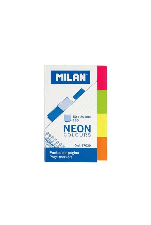 გვერდის მოსანიშნი სტიკი, ნეონის ფერებში: ყვითელი, ნარინჯისფერი, ვარდისფერი და მწვანე.